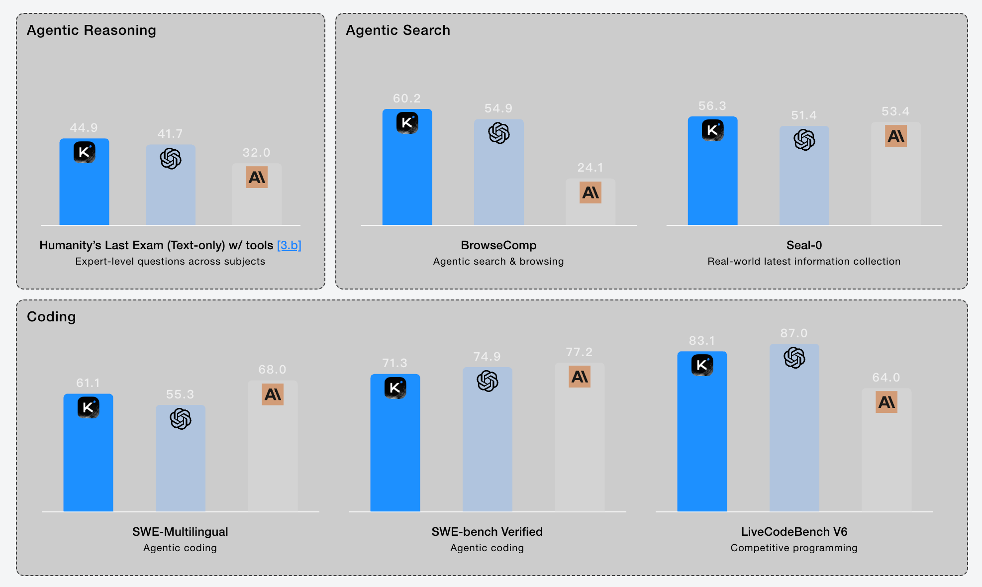 It is the first time ever an open-source model matches the State Of The Art in reasoning tasks, which probably makes Open AI and Anthropic shiver. The model scores an impressive 44.9 with tools at Humanity Last Exam , above GPT 5 and Claude Sonnet 4.5 Thinking models, and matches the current SOTA models on a number of tasks.