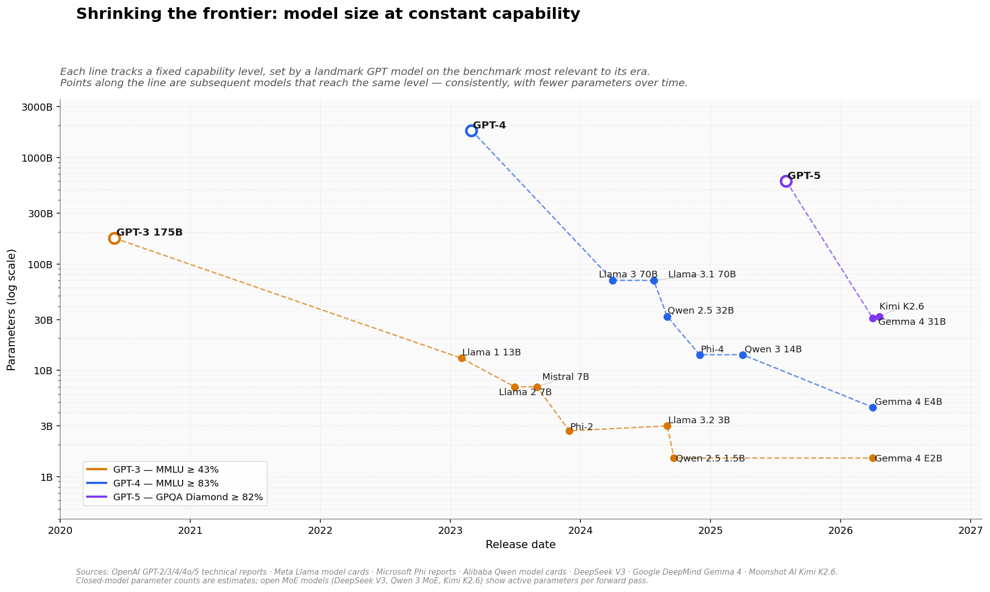 The chart below takes three landmark GPT models — GPT-3, GPT-4, and GPT-5 — and traces every subsequent model that reached the same capability level. Each line is an “iso-performance” trajectory: a fixed benchmark score, plotted against release date and parameter count.